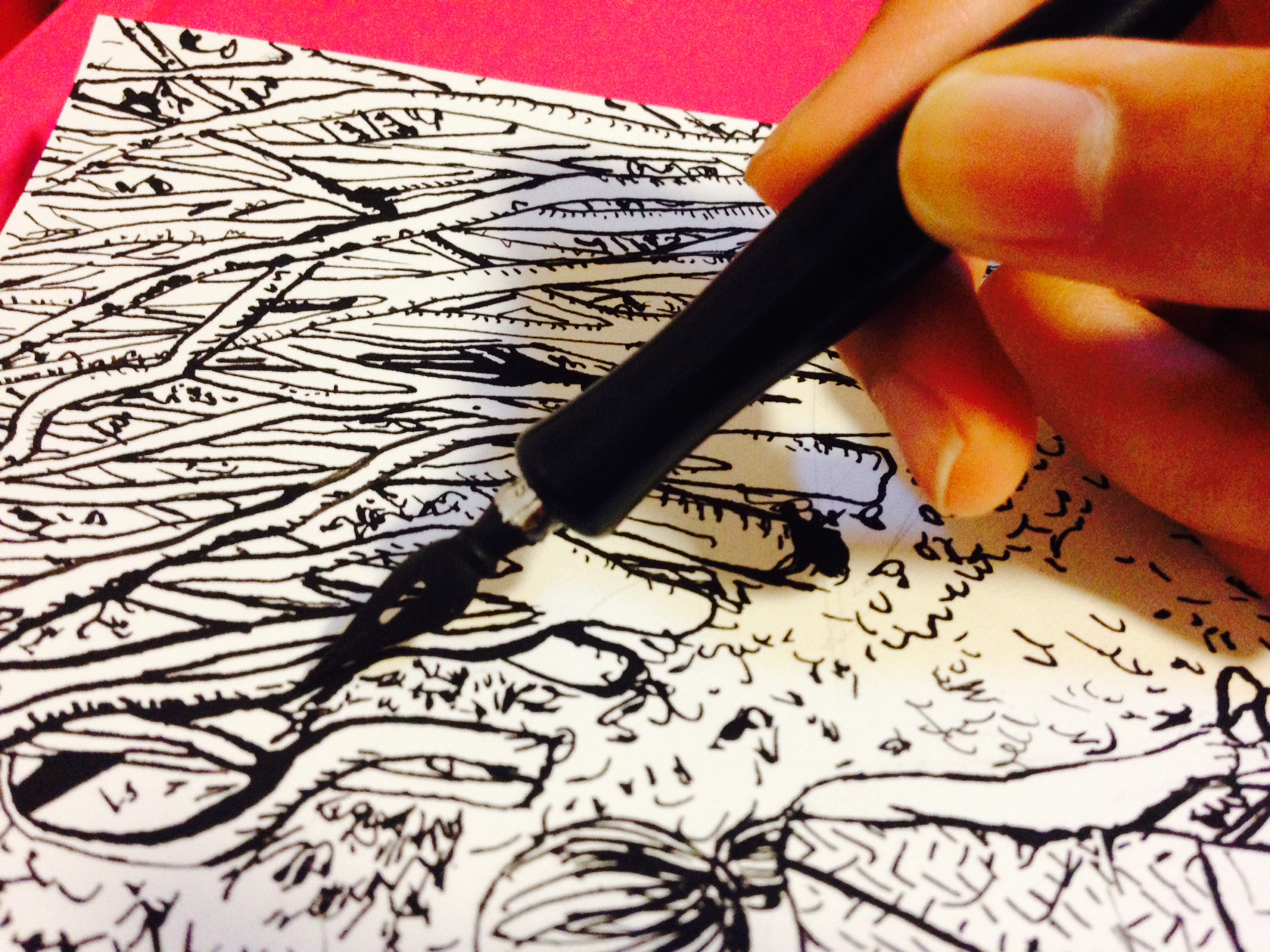 After outlining lightly with pencil, I went over it with a calligraphy pen, adding in shading and details.