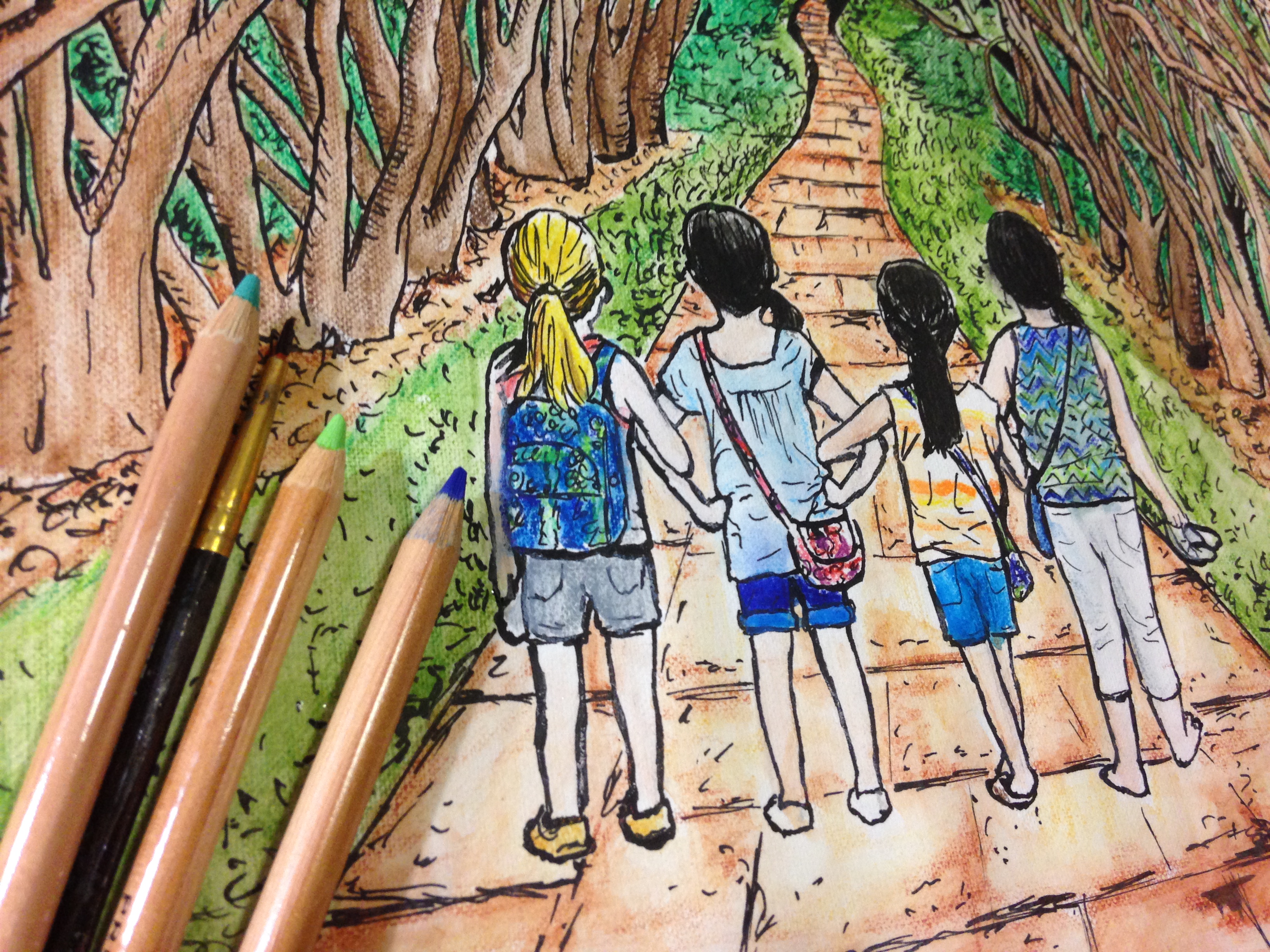 Here’s the finished product! I’m thinking of calling it “Down Friendship Lane”. It was from a picture of my little sister (2nd from the left) and her three best friends. It’s my first try with my new Prismacolor watercolor pencils! They were a good buy!